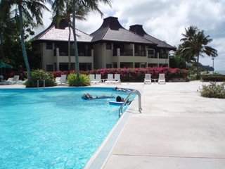 ホテルのプールで大槻さんと川村さんの仲良し2ショット。ビーチマットで昼寝中。