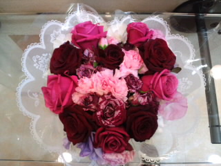 先日お客様からいただいた花です。バレンタインにちなんでハート型になっているんですが、気づきましたか。このような贈り物もすてきですよね(o^∀^o)塚本
